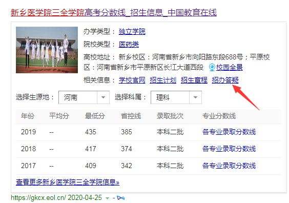 搜索新乡医学院三全学院,即可进入高考数据库页面,通过高考卡片中的招办答疑窗口可进入学校招生咨询智能问答系统,完善基础信息后即可在线咨询或留言。