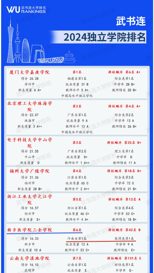 5月31日,武书连2024中国民办大学独立学院排名公布,我校整体表现突出:位居全国145所独立学院综合实力排行榜第六名,蝉联全国医学类独立学院排行榜第一名,就业质量,新生质量,升学率评价等级均为A等A级。